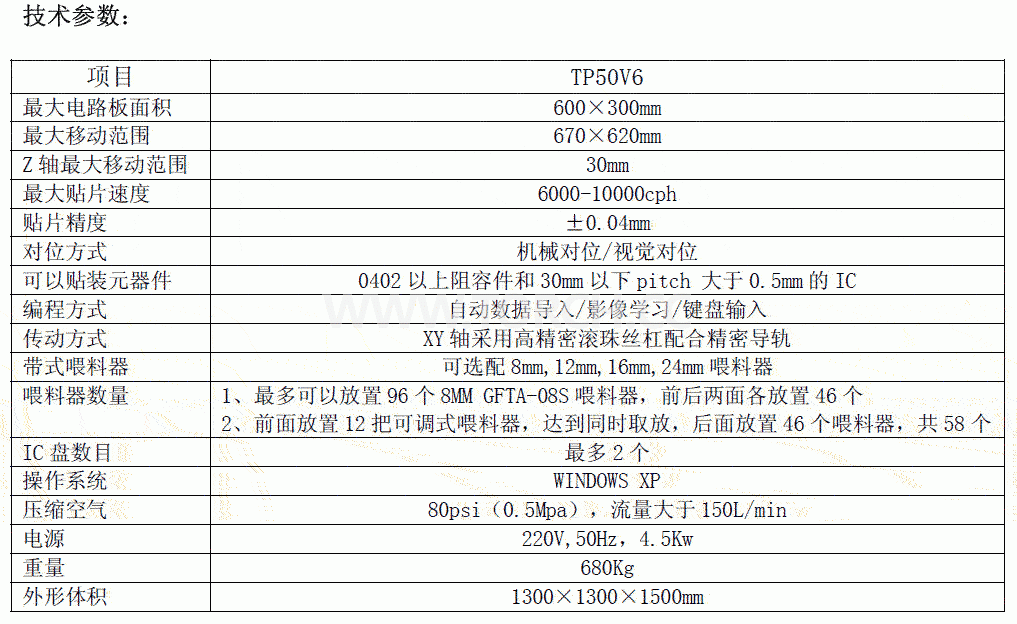 高速貼片機TP50V6是一款全自動視覺貼片機,它通過真空吸嘴可以貼裝各種元件,是目前市場上性價比高的全自動貼片設備。本產品適合大部份SMD 片狀元件0402, SOIC, PLCC 及QFPIC;配置視覺對中系統(tǒng),滿足高精密度0.5mm 腳距之QFP IC 或BGA 等芯片的貼裝.除標準的圓形基準點外,不絲印焊錫膏的方形的PCB 焊盤和環(huán)型穿孔焊盤,也可作為基準點來識。